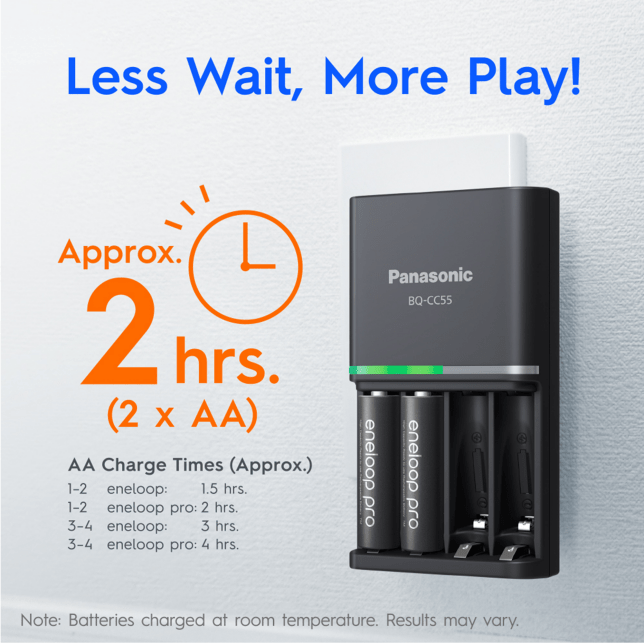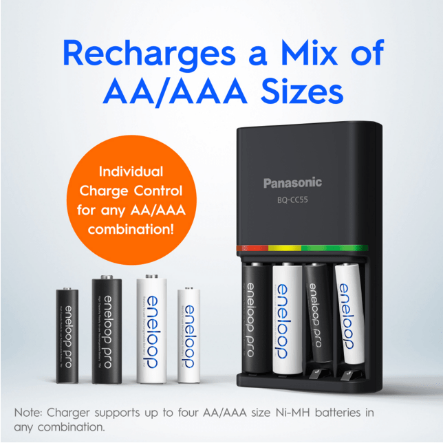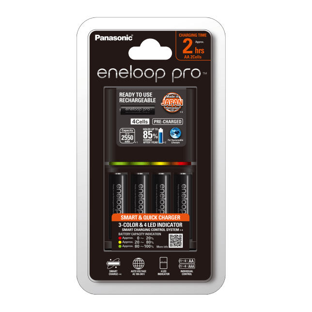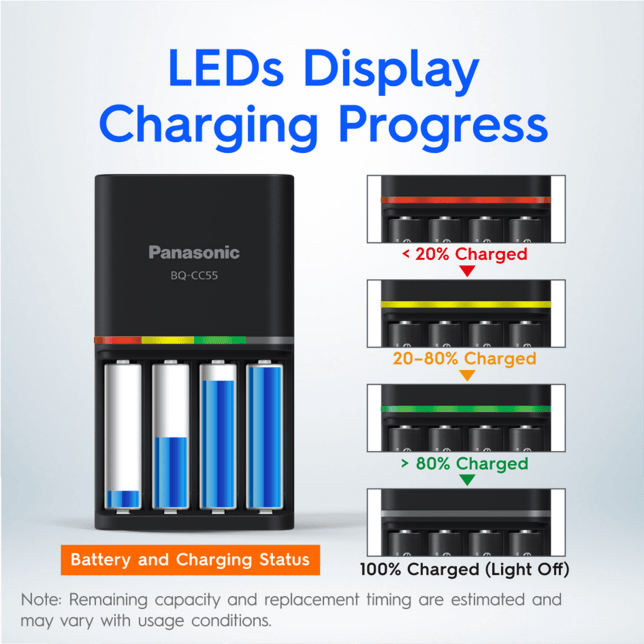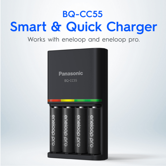 Panasonic BQ-CC55 battery charger individually charges each eneloop and eneloop pro AA and AAA rechargeable battery conveniently.