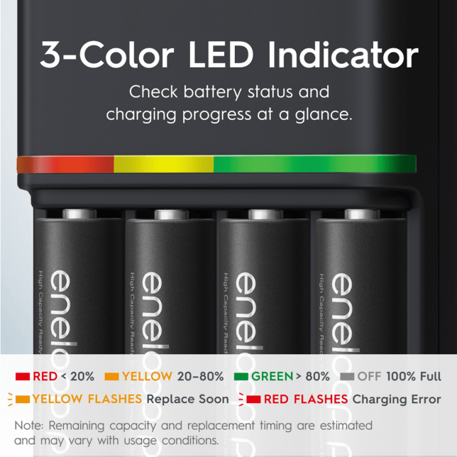 You can easily and efficiently individually charge any combination of up to four AA or AAA eneloop batteries.